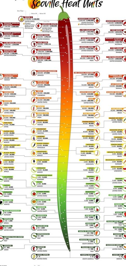 A scale developed by Wilbur Scoville in 1912. The Scoville Scale is a measurement of the pungency (spiciness or “heat”) of chili peppers, as recorded in Scoville Heat Units (SHU). It is based on the concentration of capsaicinoids, capsaicin being the predominant component.